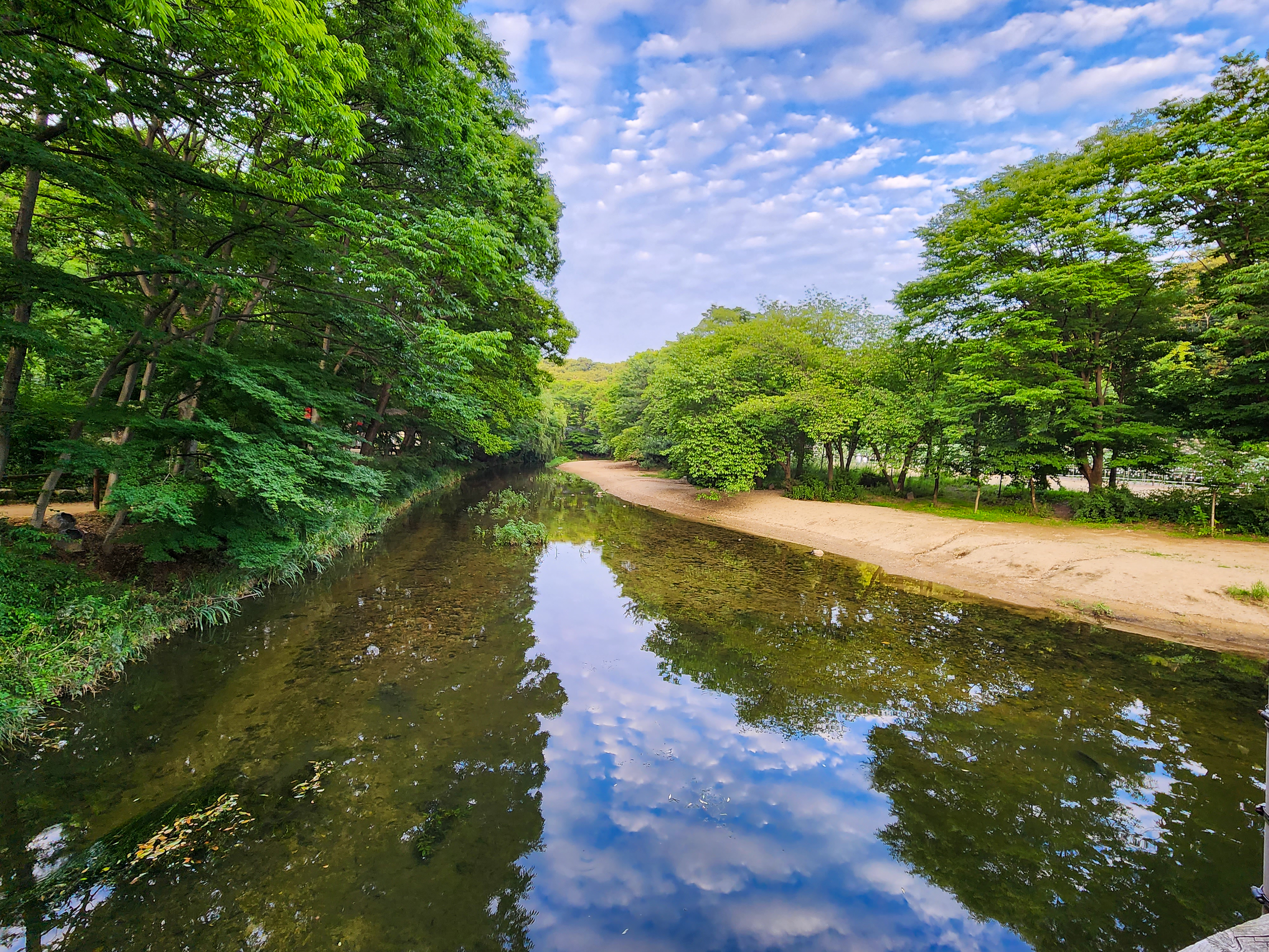 푸른 하늘과 초록 나무들과 기와집, 초가집의
