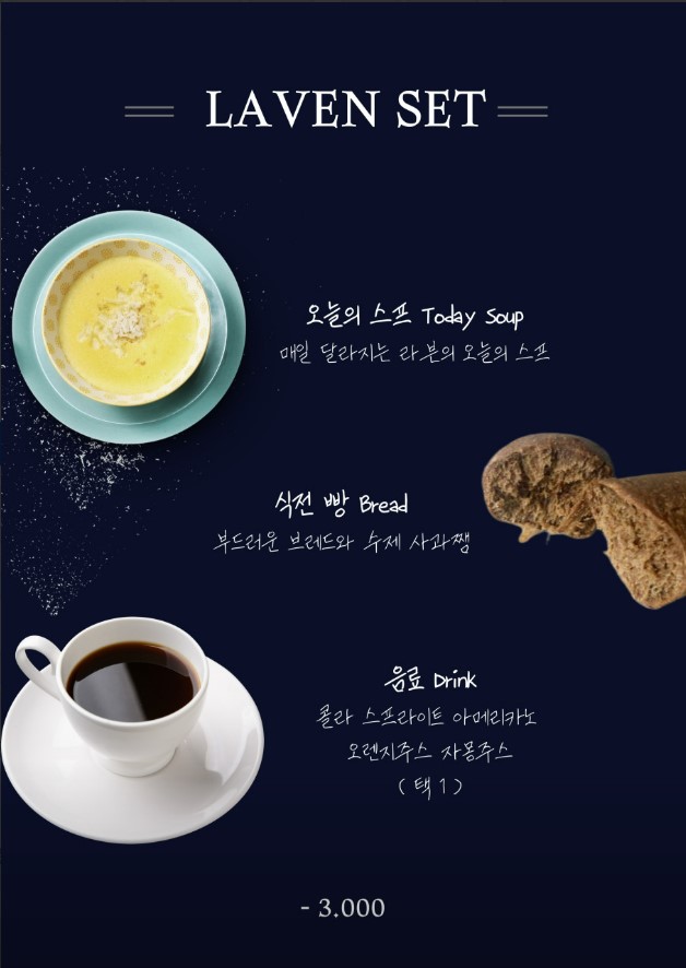 메인 메뉴 + 오늘의 스프 + 식전빵 + 음료 를 즐길 수 있어요.