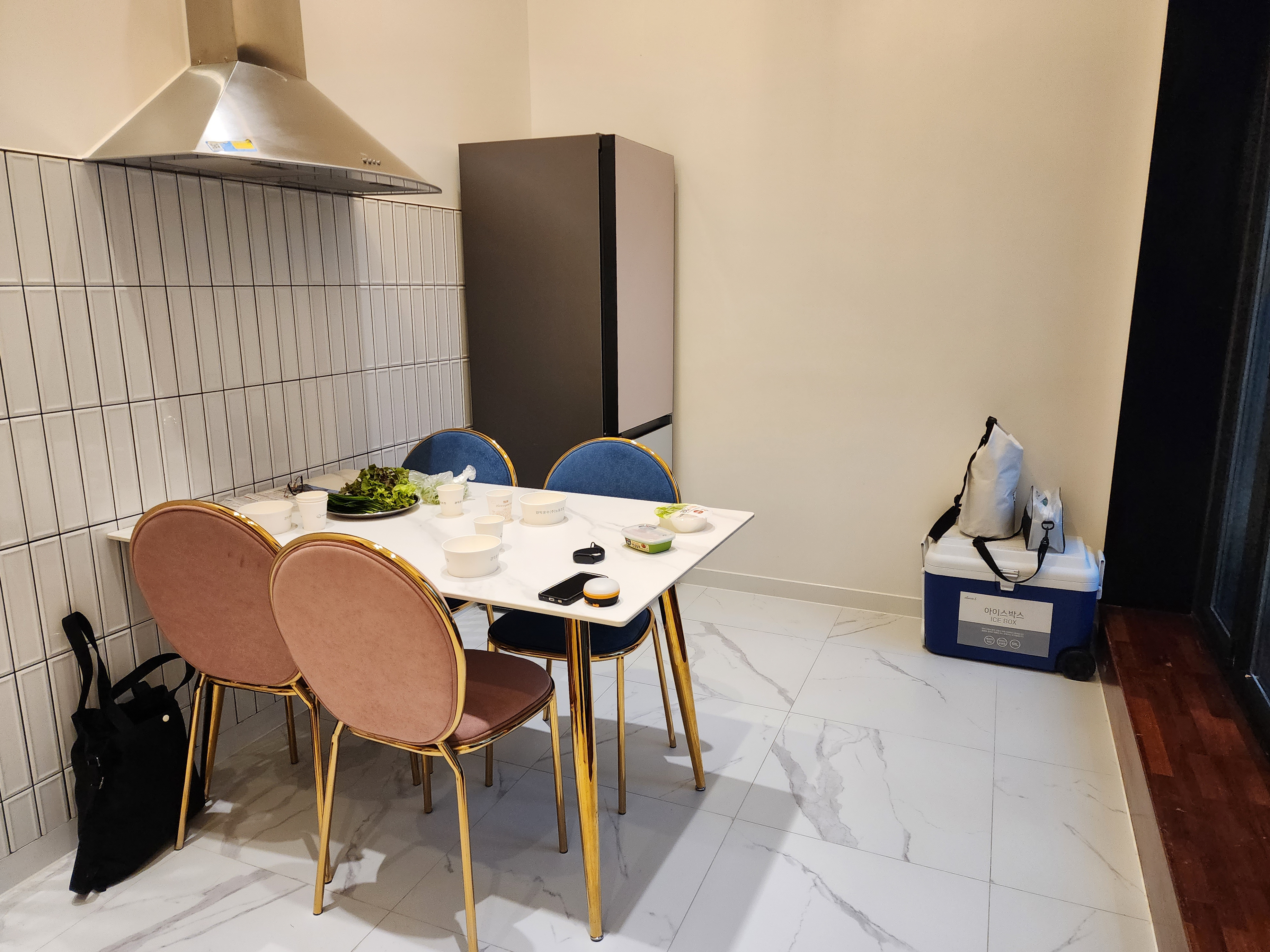 식탁, 냉장고, 수영장 입구가 있어요.