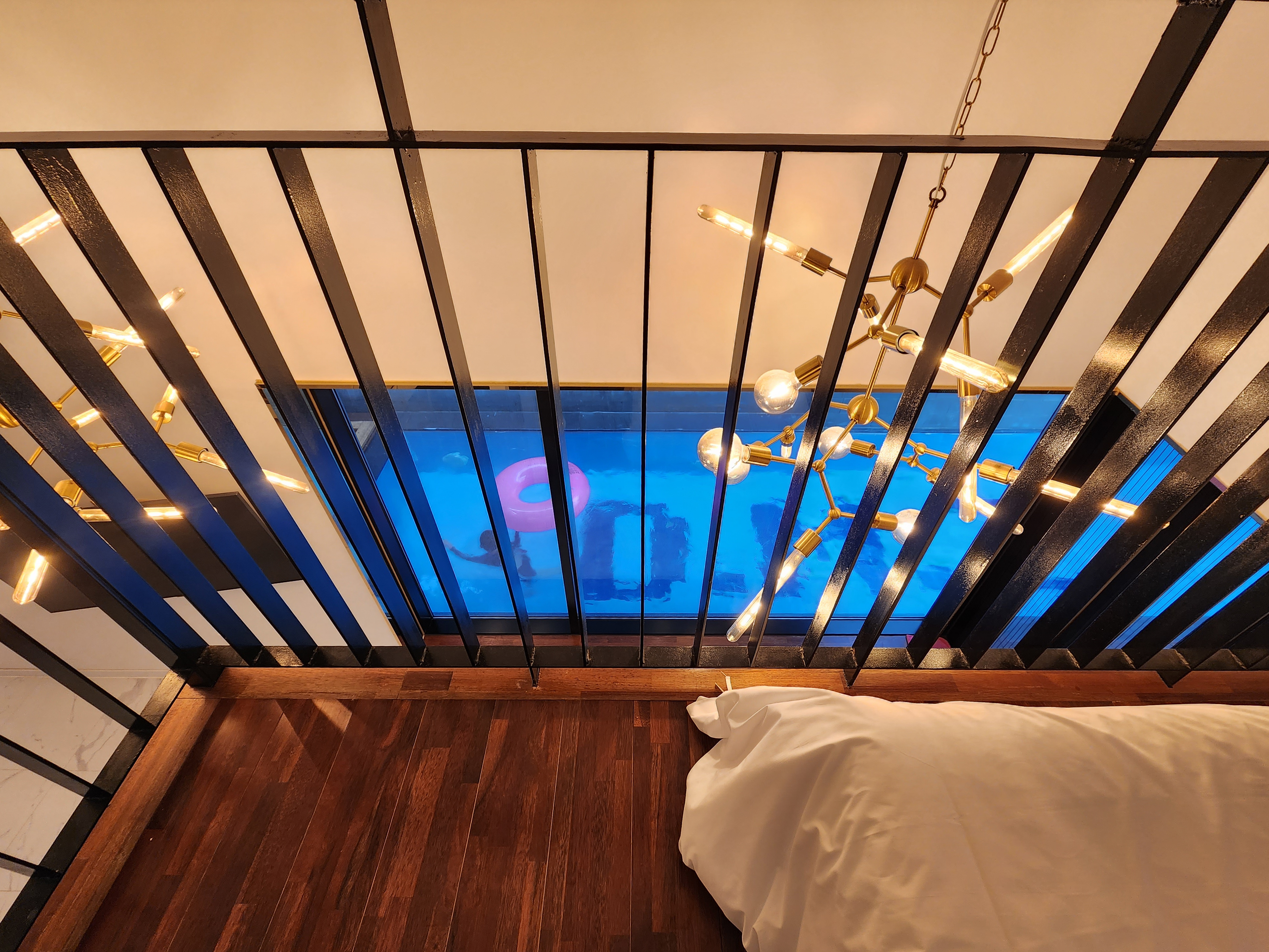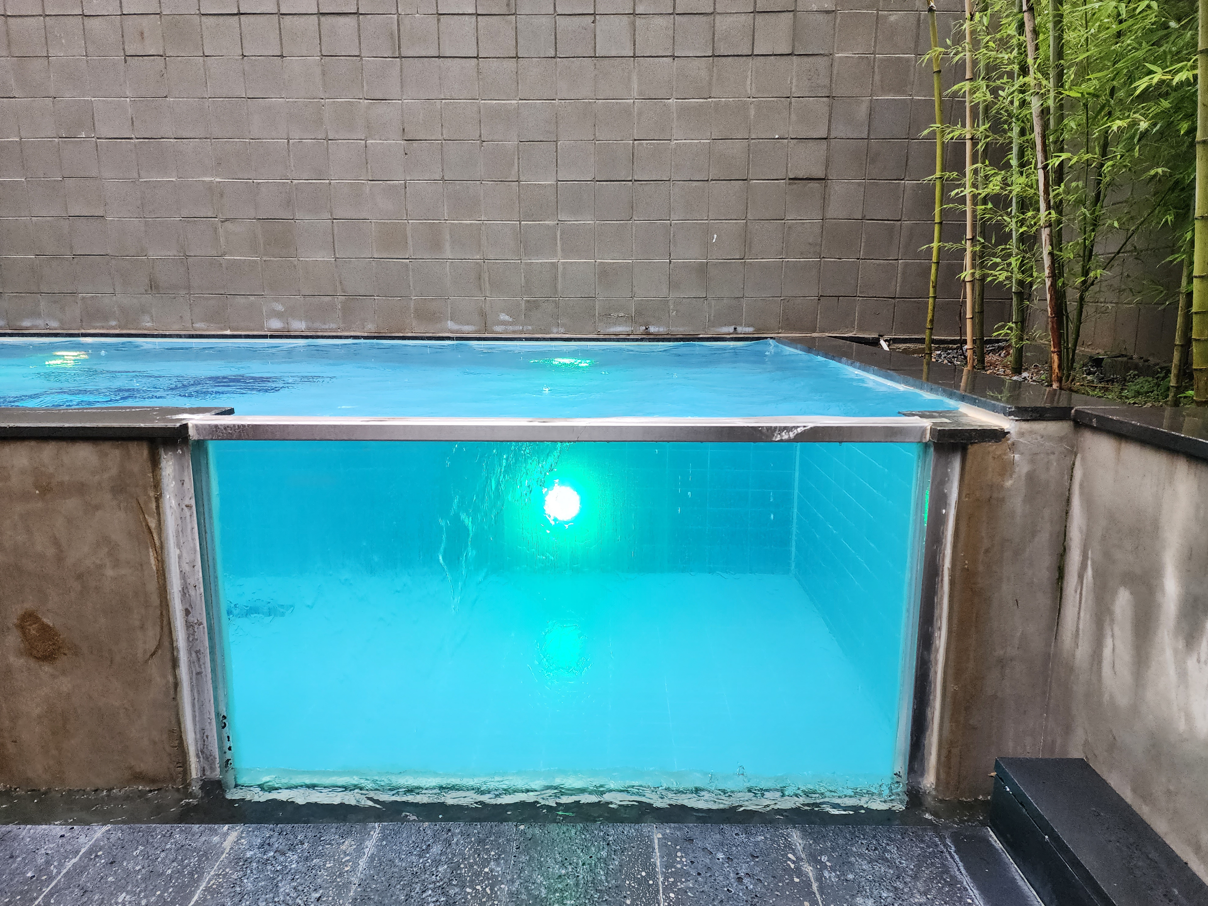 해지기 전에 수영장에 조명이 들어와요.