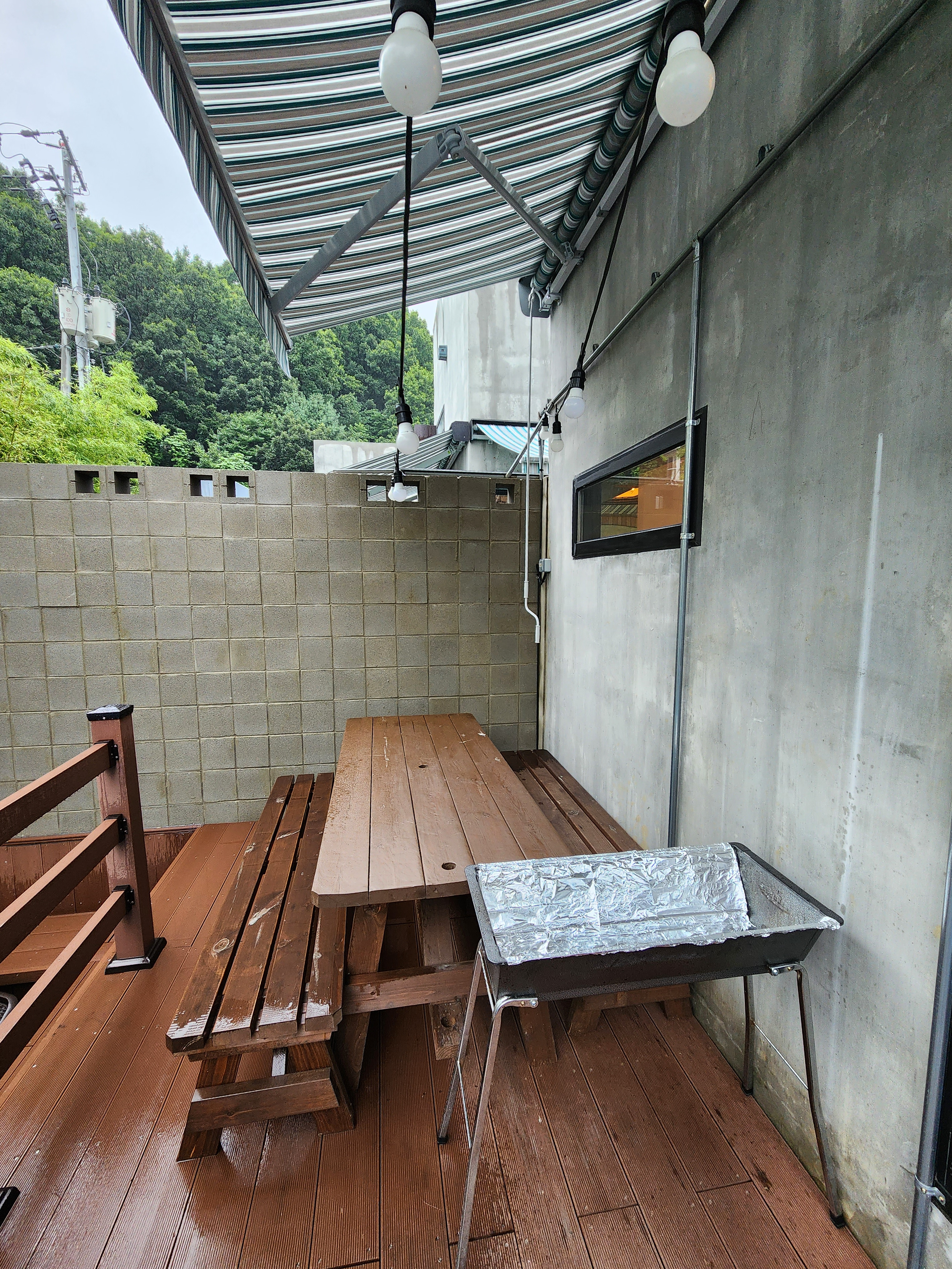 히노끼탕 위에는 천막이 설치되어 있지 않아요.