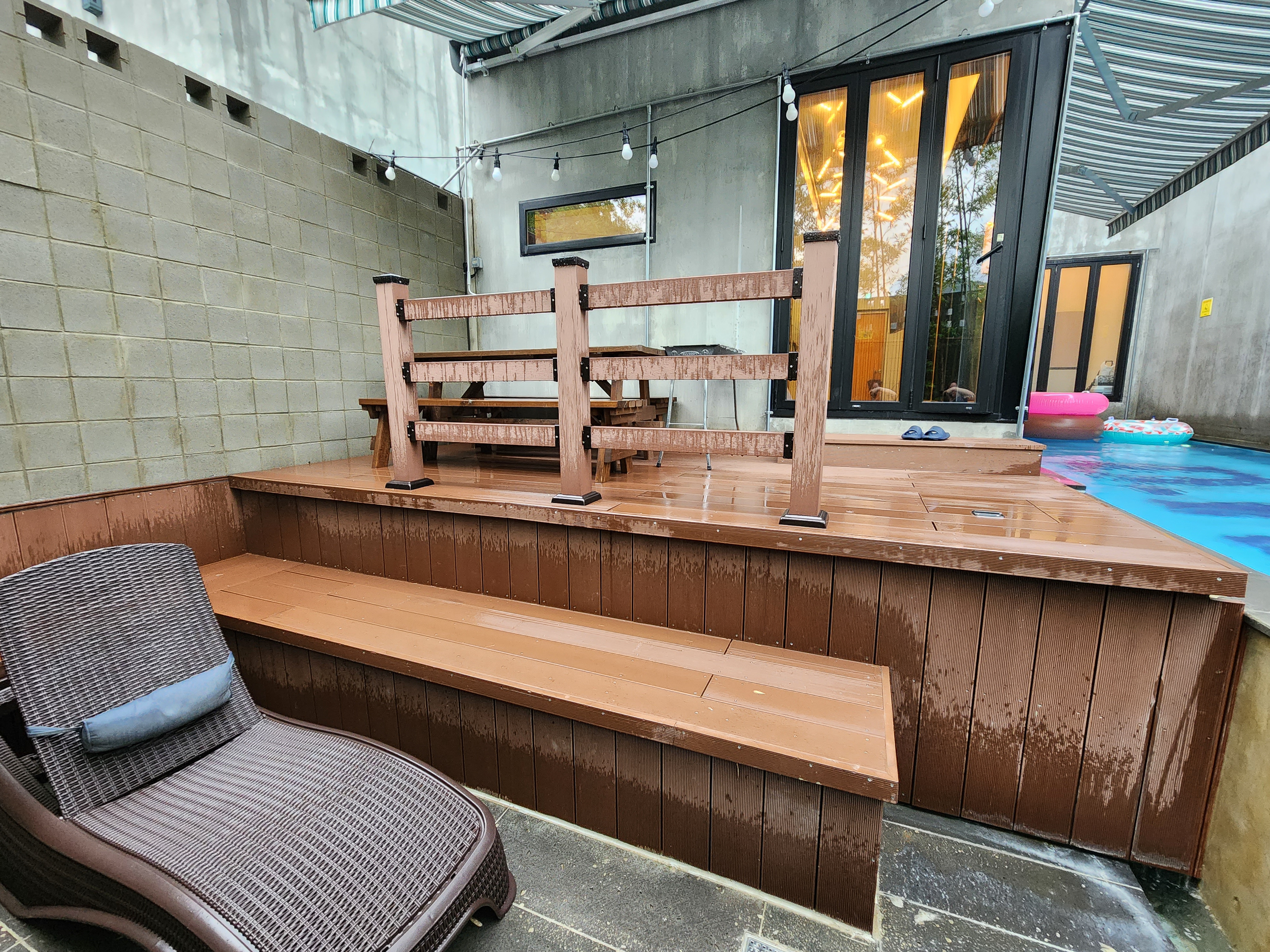 식탁, 냉장고, 수영장 입구가 있어요.