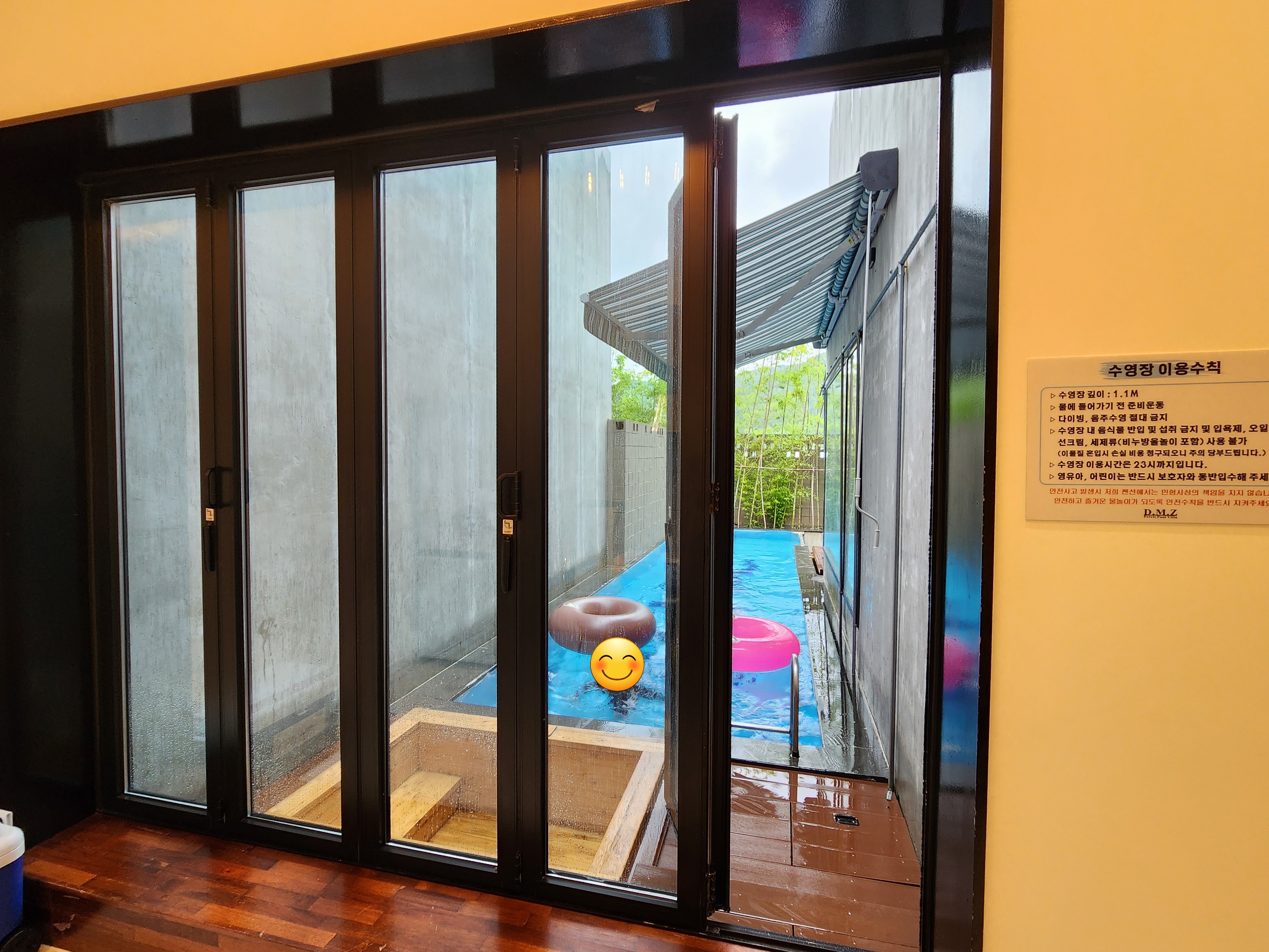 수영장 입구는 식탁 앞에 있어요.