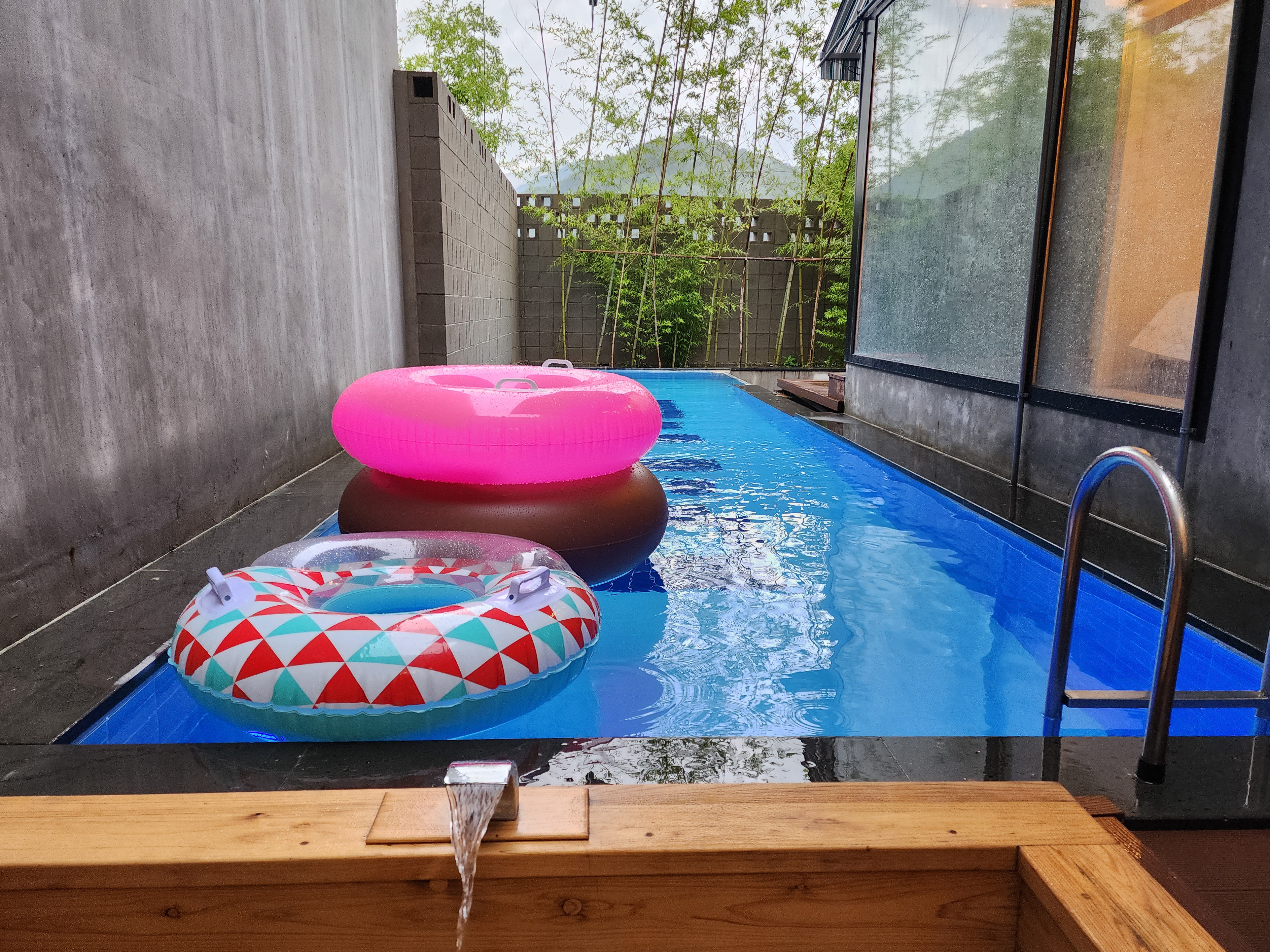 히노끼탕이 있고 수영장이 있어요.
