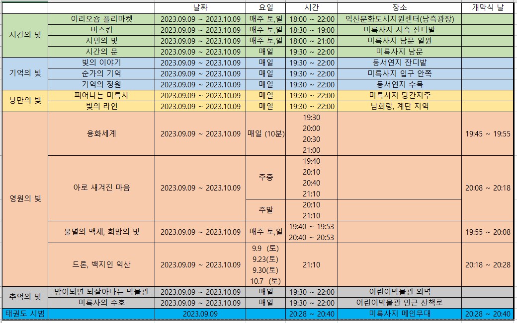공개된 행사들의 시간과 장소를 정리해 보았어요.