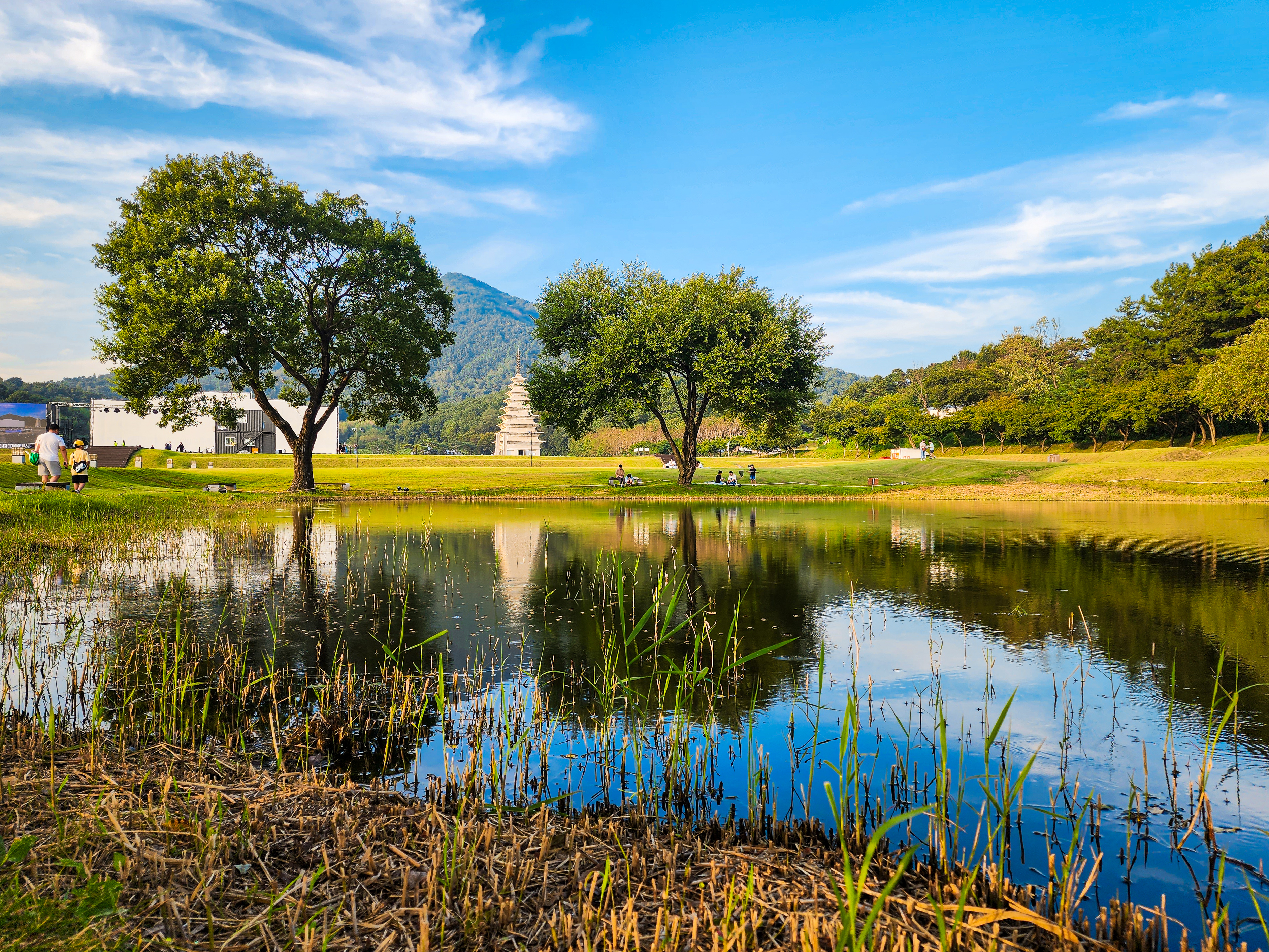 연못 근처에 돗자리 깔고