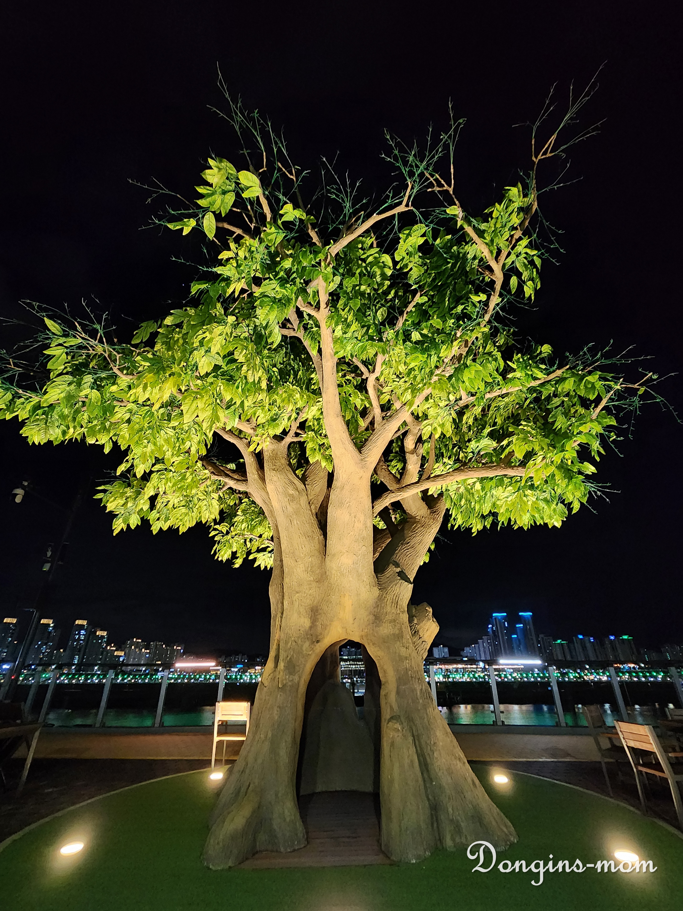 나무 형태의 조형물 속에서 악기를 연주하며 귀와 눈이 즐거워지는 공간