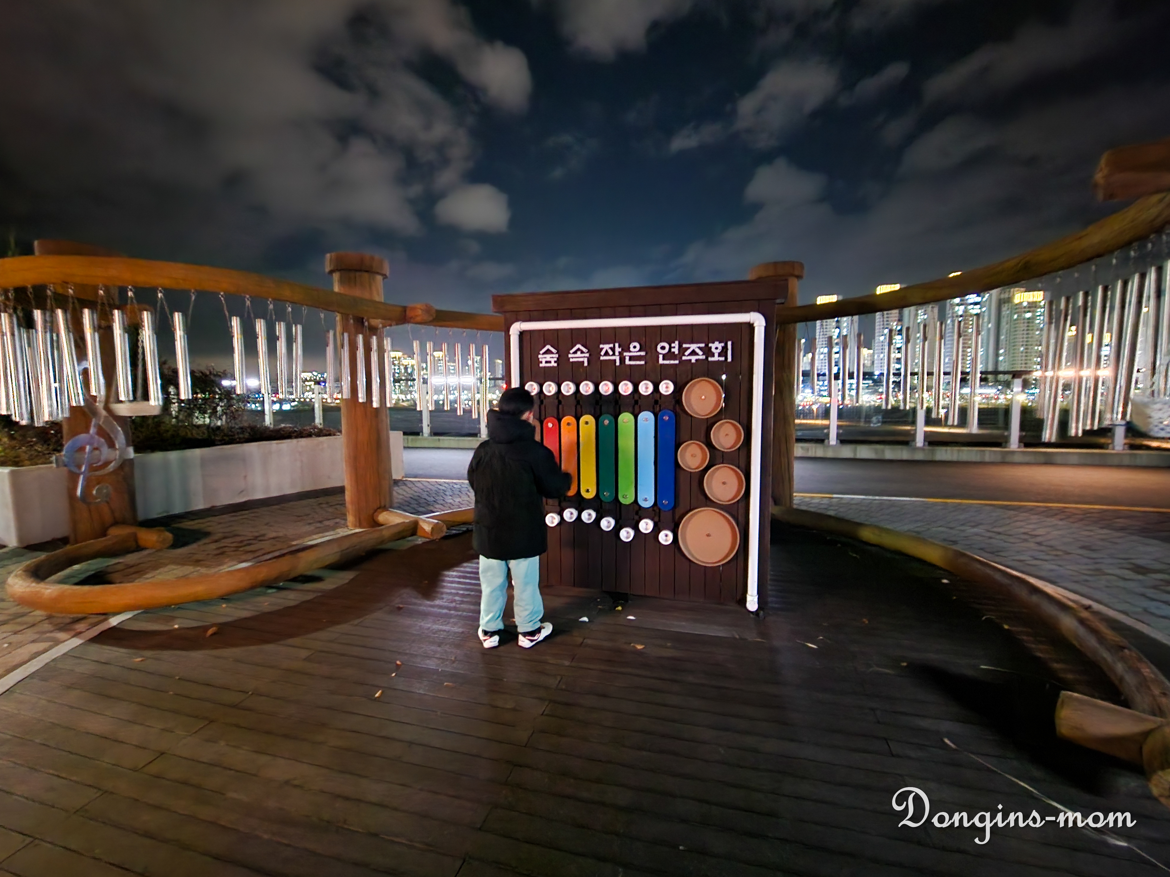 나무 형태의 조형물 속에서 악기를 연주하며 귀와 눈이 즐거워지는 공간