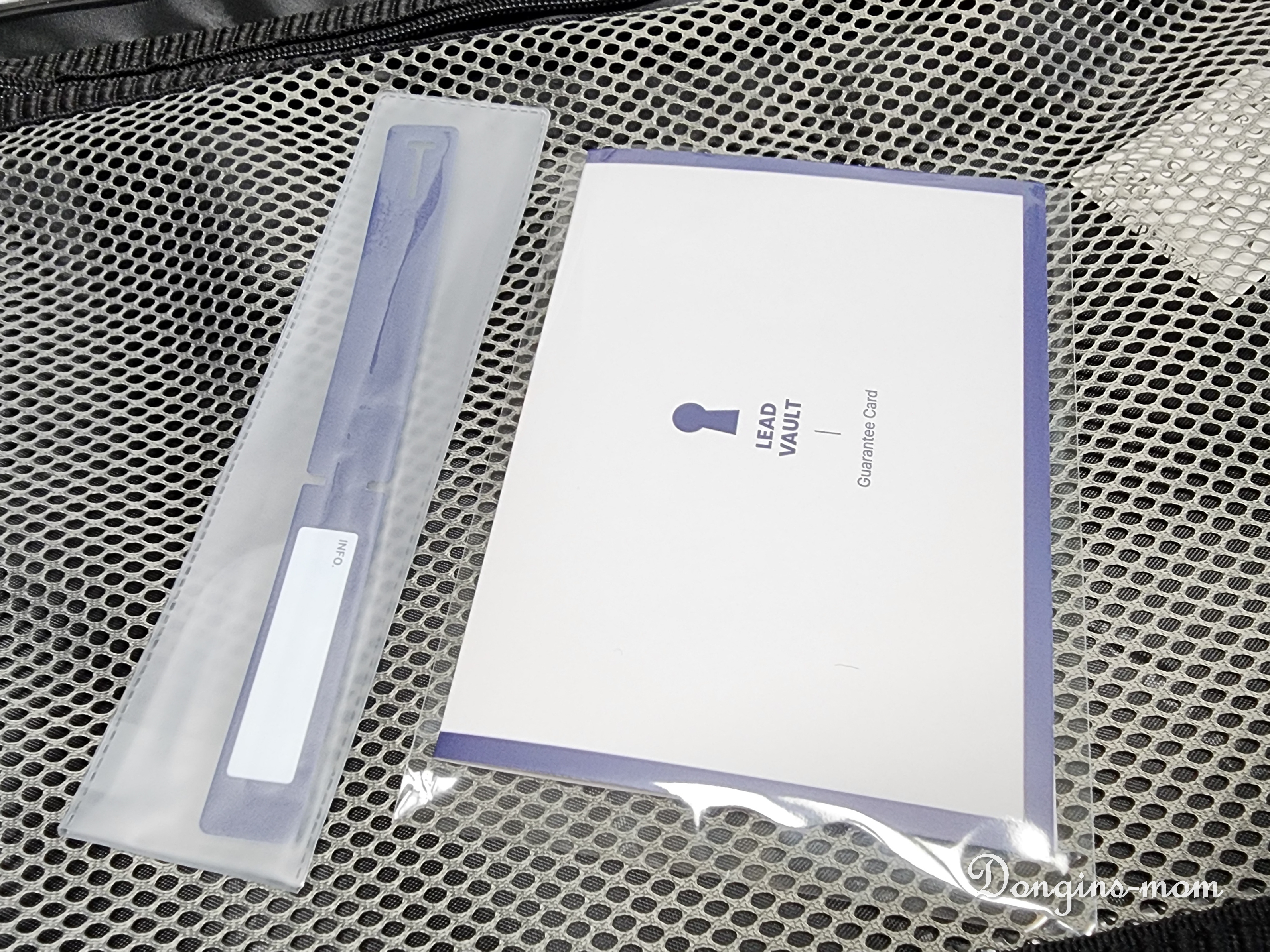 투명 메쉬포켓에는 네임텍과 품질보증서가 들어 있어요.
