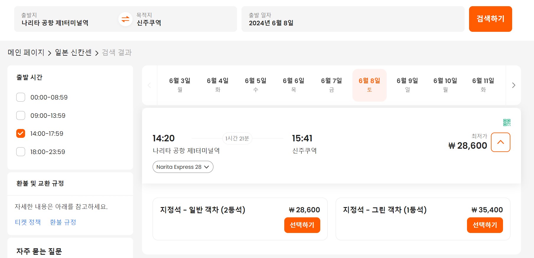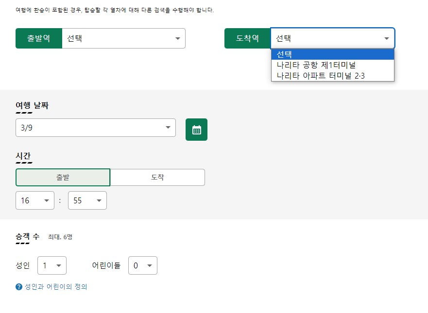 1) 출발역, 도착역, 탑승 날짜, 탑승 시간을 선택하여 예약 하시면 되요.