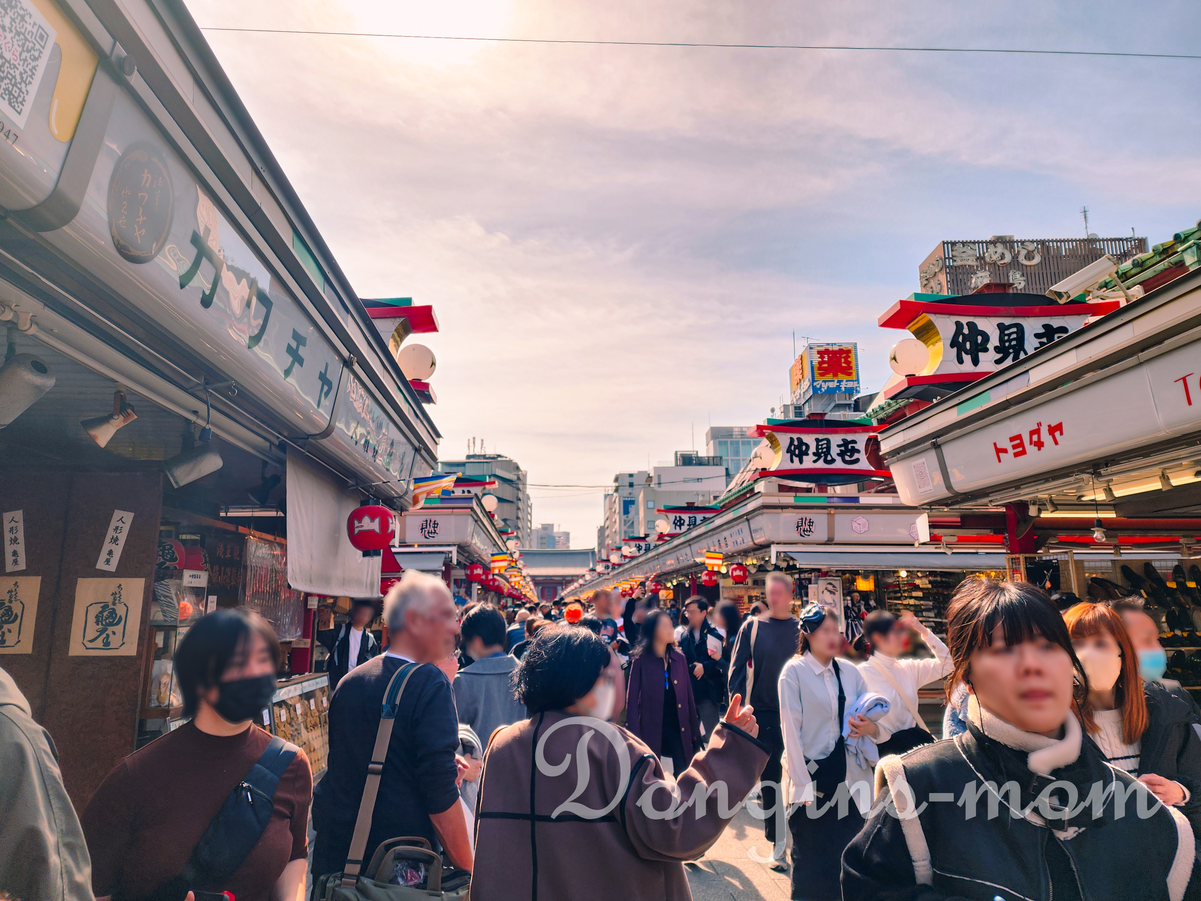 카미나리몬에서 호조몬까지 약 250m 에 걸쳐 참배길 양쪽에 점포가 늘어서 있어요.