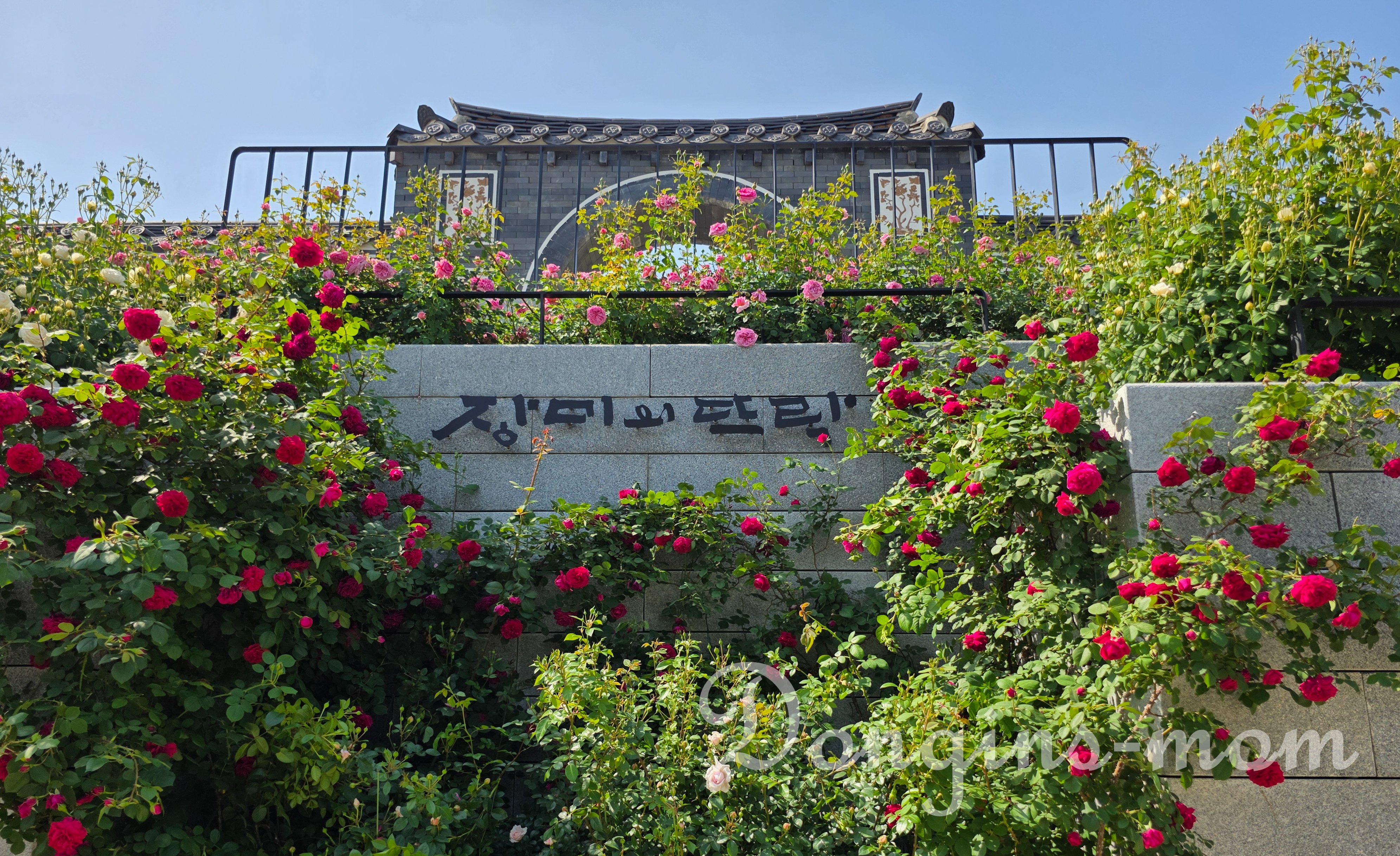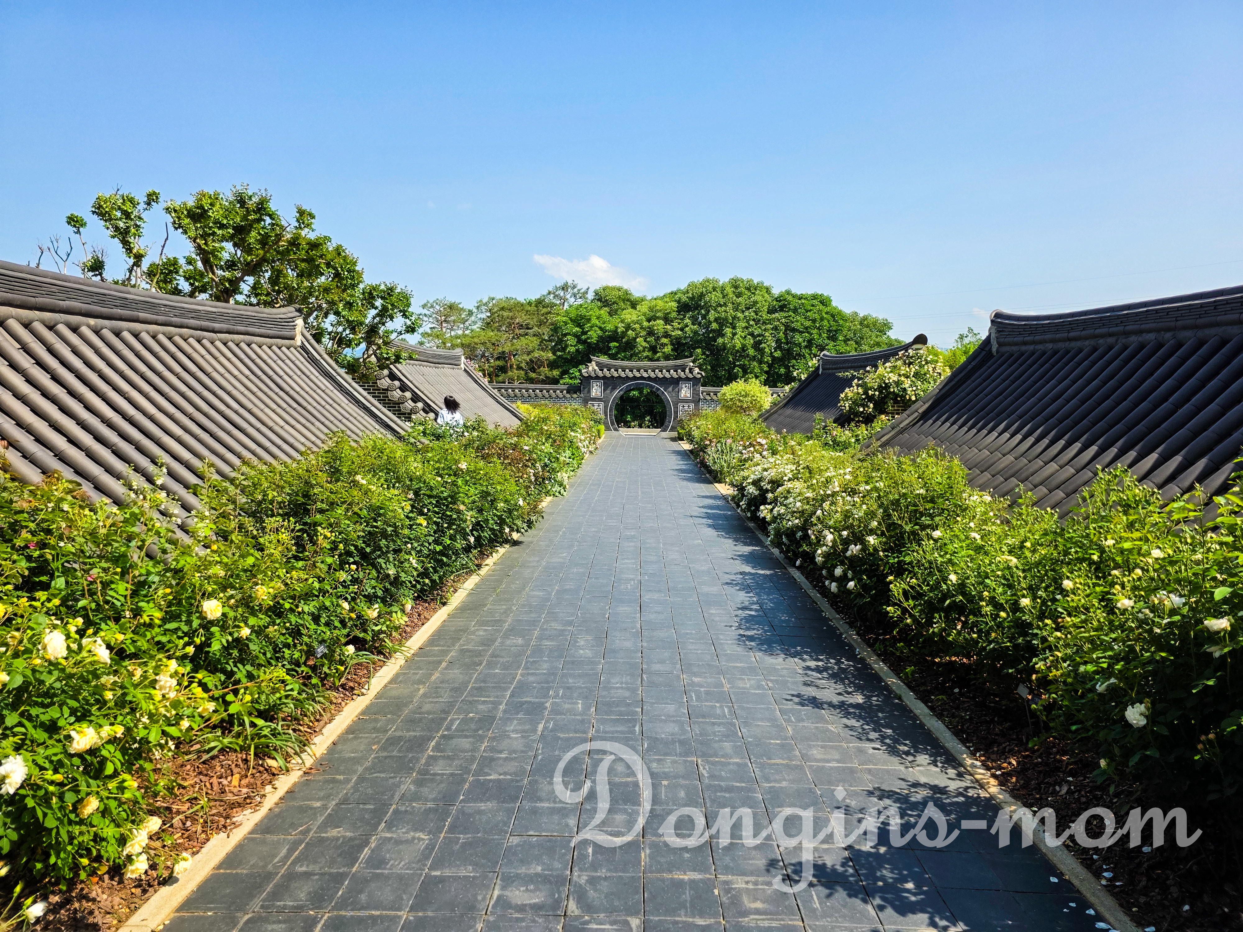 한국 한옥 기와 현태의 구조물과 장미가 어우어져 정서적으로 따뜻하면서 현대적인 감각을 느낄 수 있습니다.