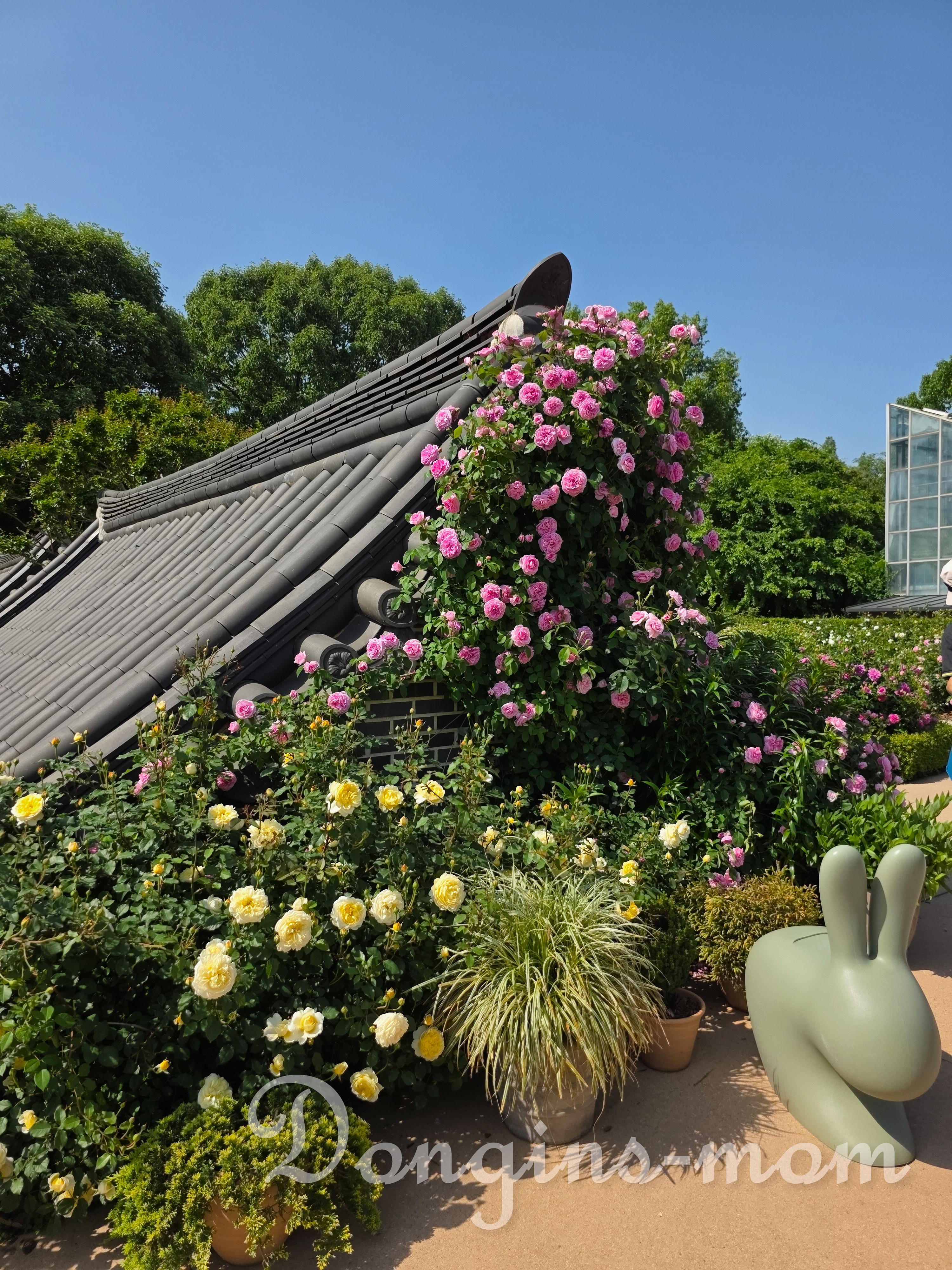 한국 한옥 기와 현태의 구조물과 장미가 어우어져 정서적으로 따뜻하면서 현대적인 감각을 느낄 수 있습니다.