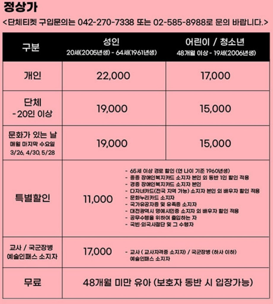 교사 / 국군장병 / 예술인패스 소지자 : 17,000원