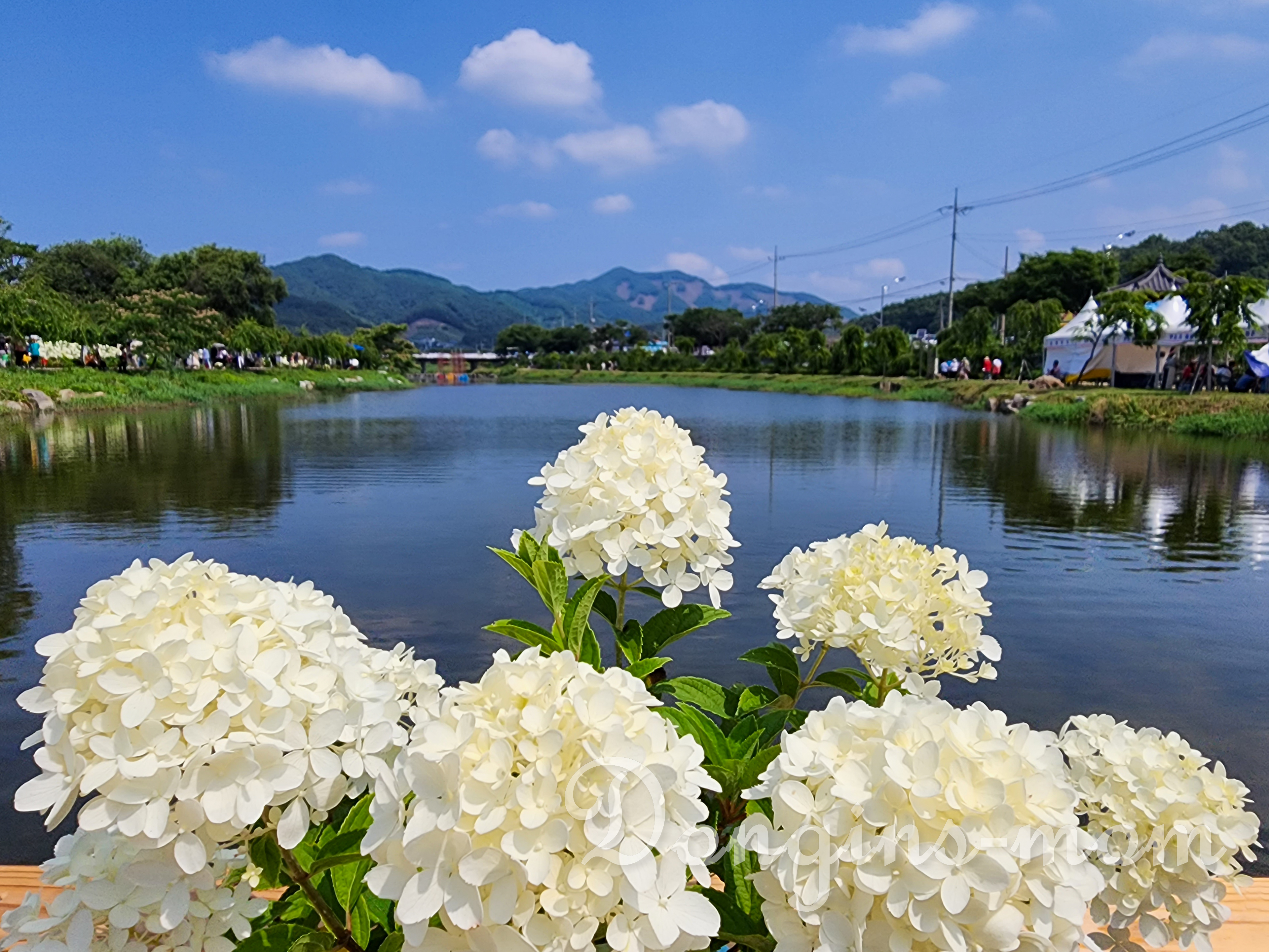 잔잔한 물과 어우러진 수국을 볼 수 있습니다.