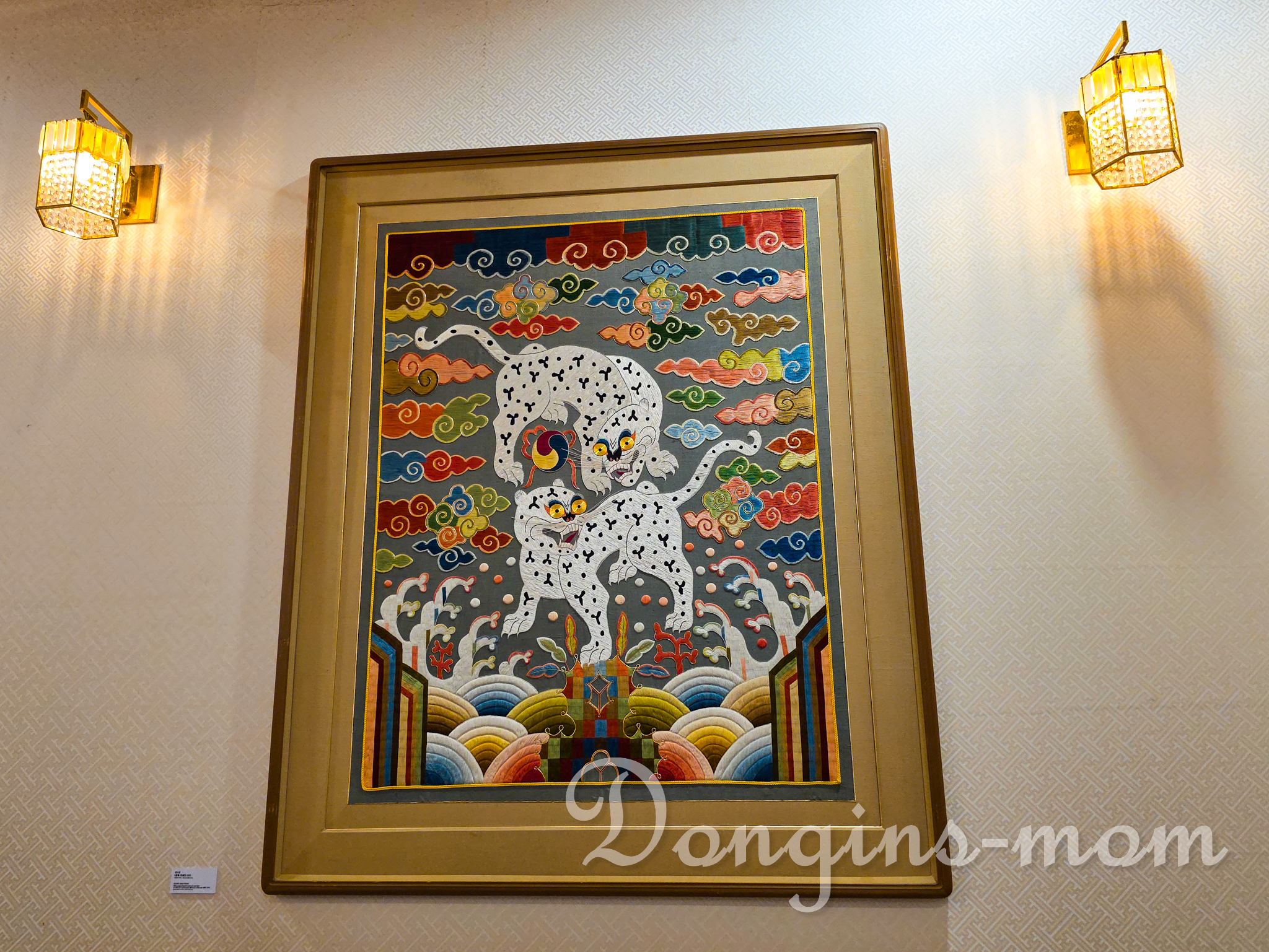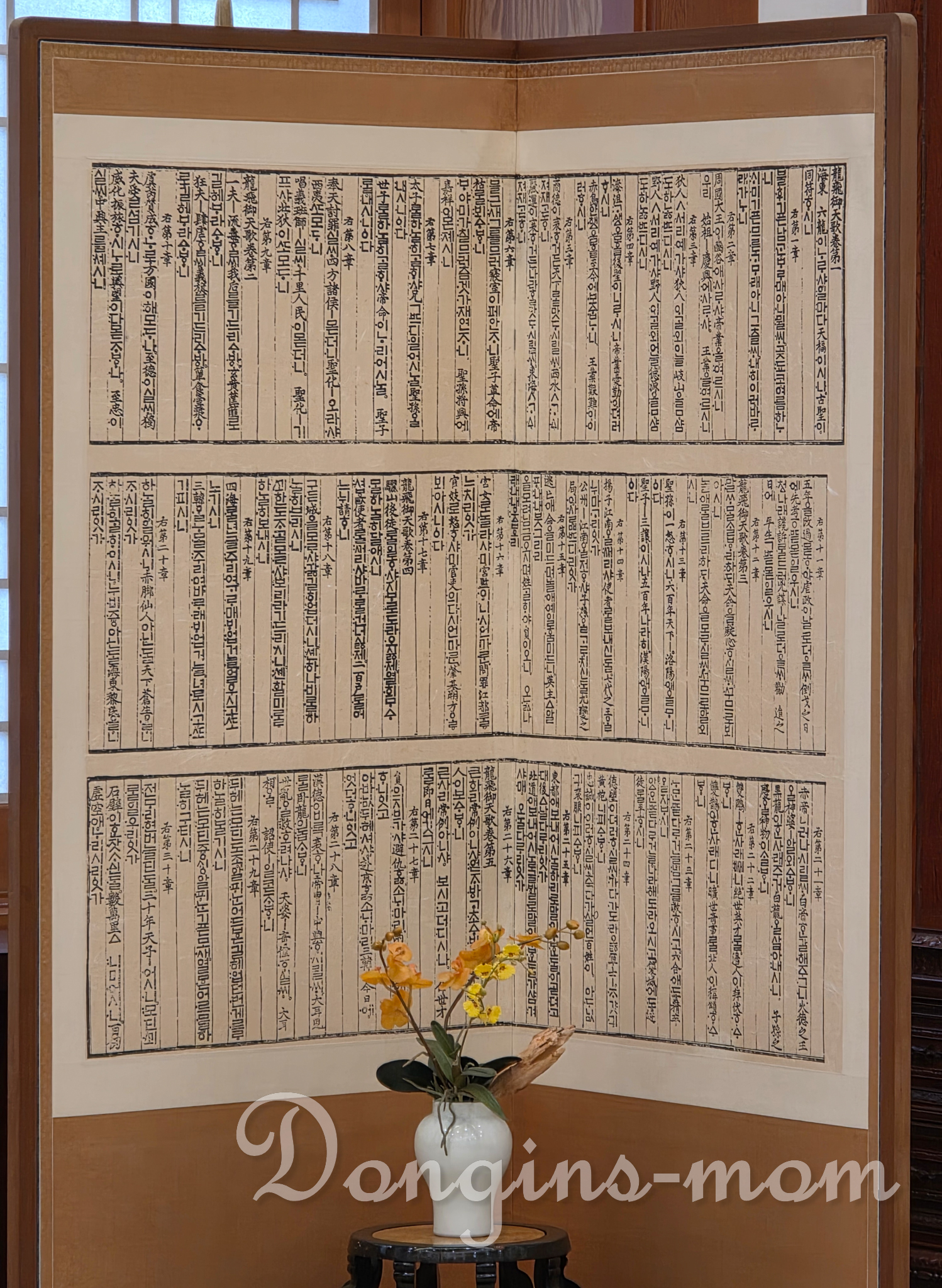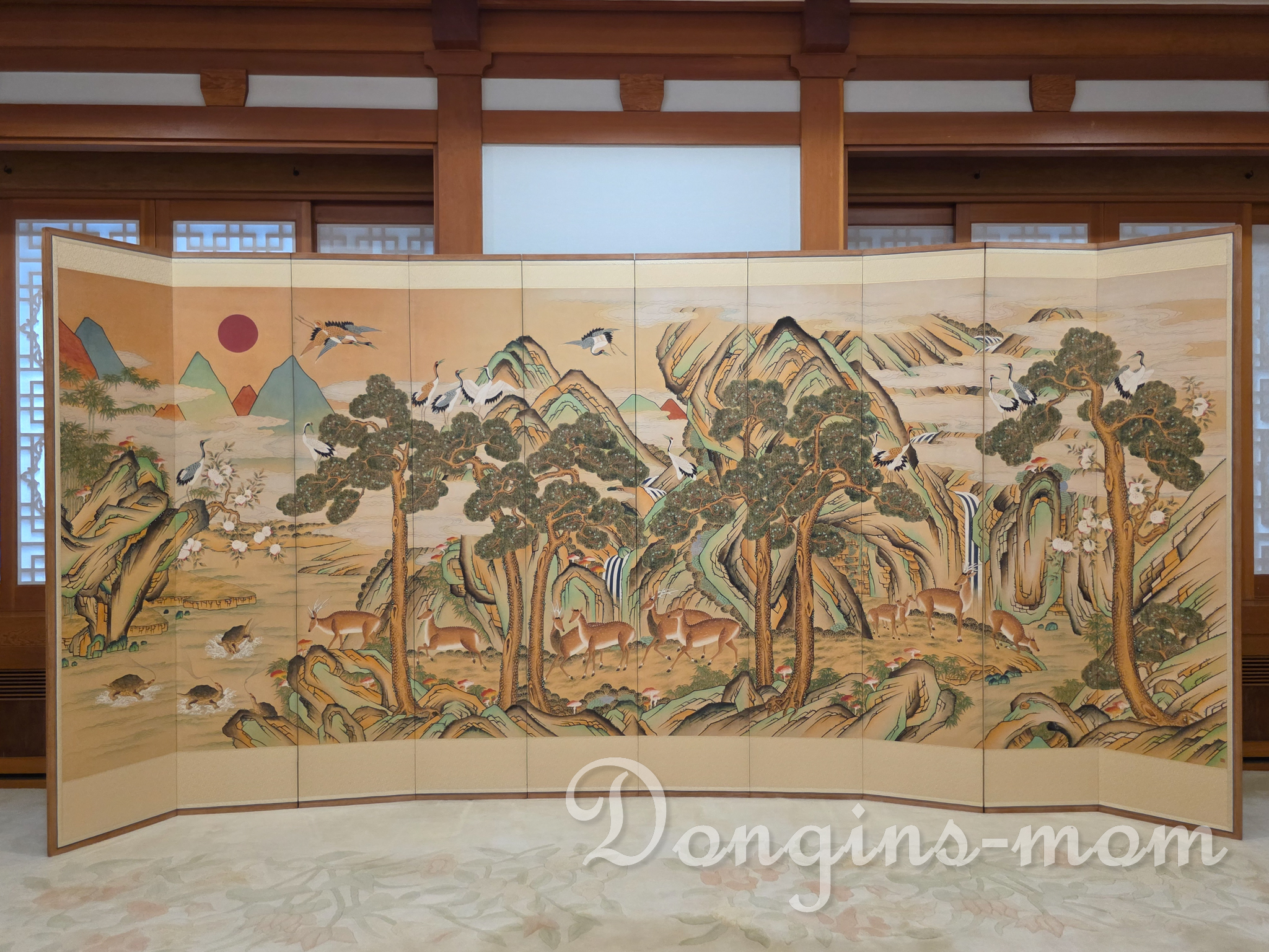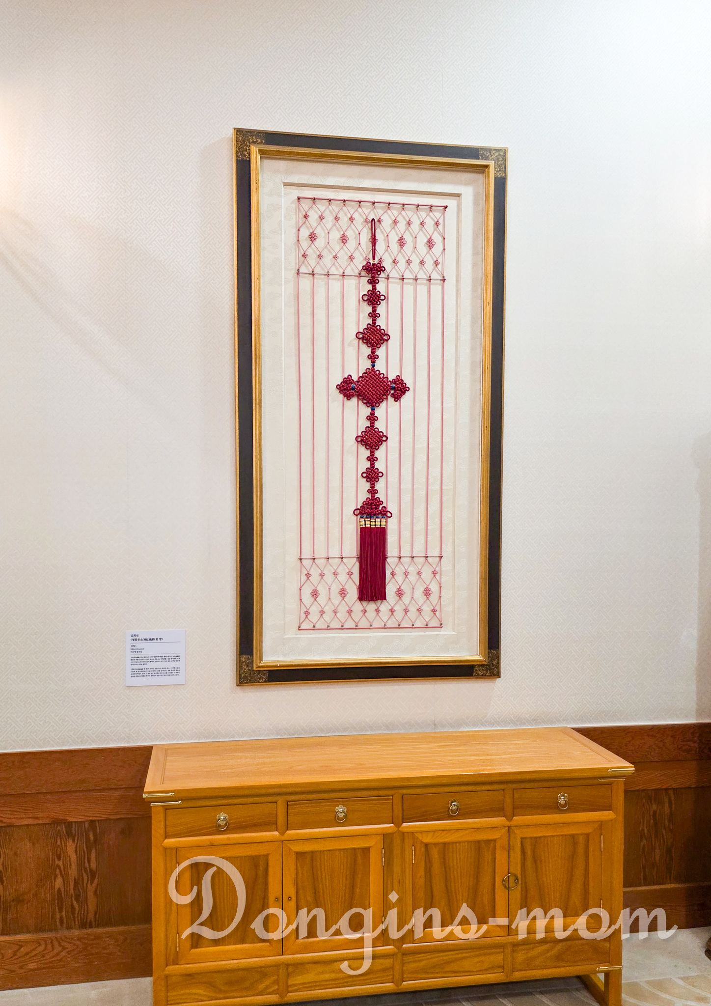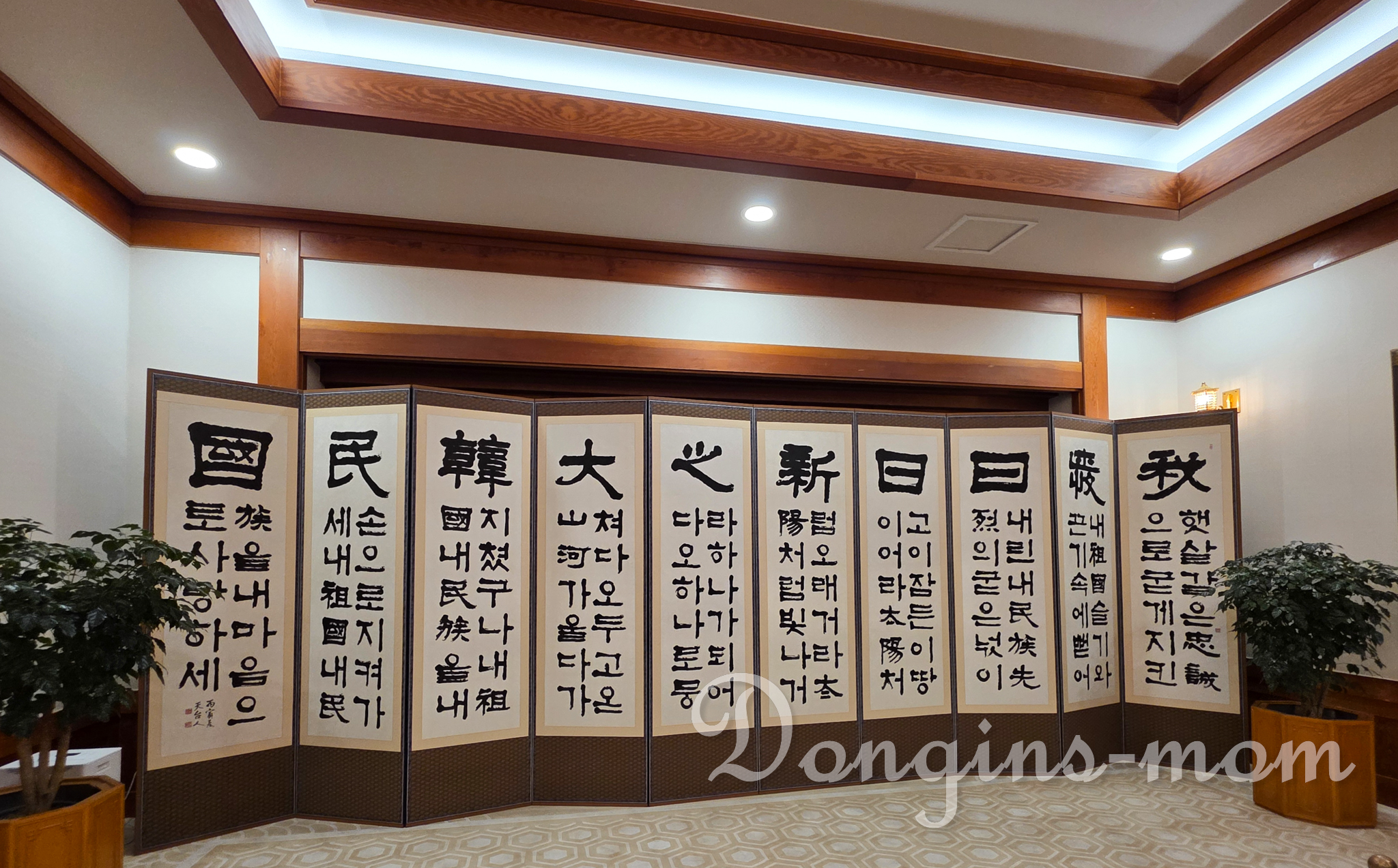 동쪽 벽면은 황금색 [십장생 문양도]로 장식하였으며 창문은 나무 창틀과 문상 위에 한지를 이용하여 한국적인 분위기를 연출하였습니다.