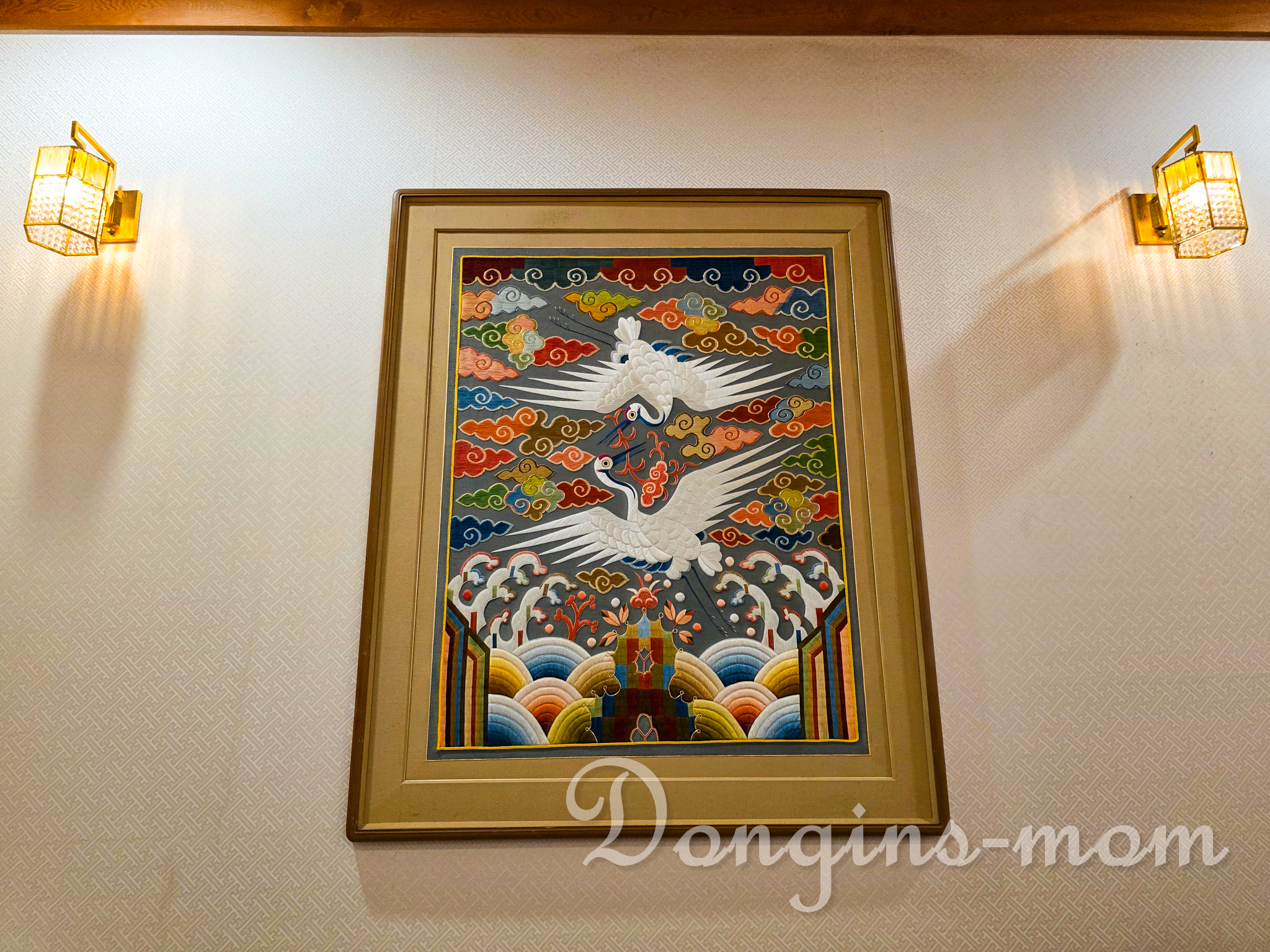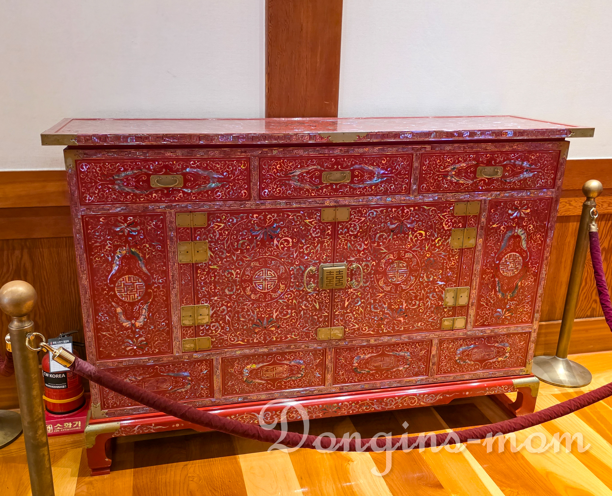동쪽 벽면은 황금색 [십장생 문양도]로 장식하였으며 창문은 나무 창틀과 문상 위에 한지를 이용하여 한국적인 분위기를 연출하였습니다.