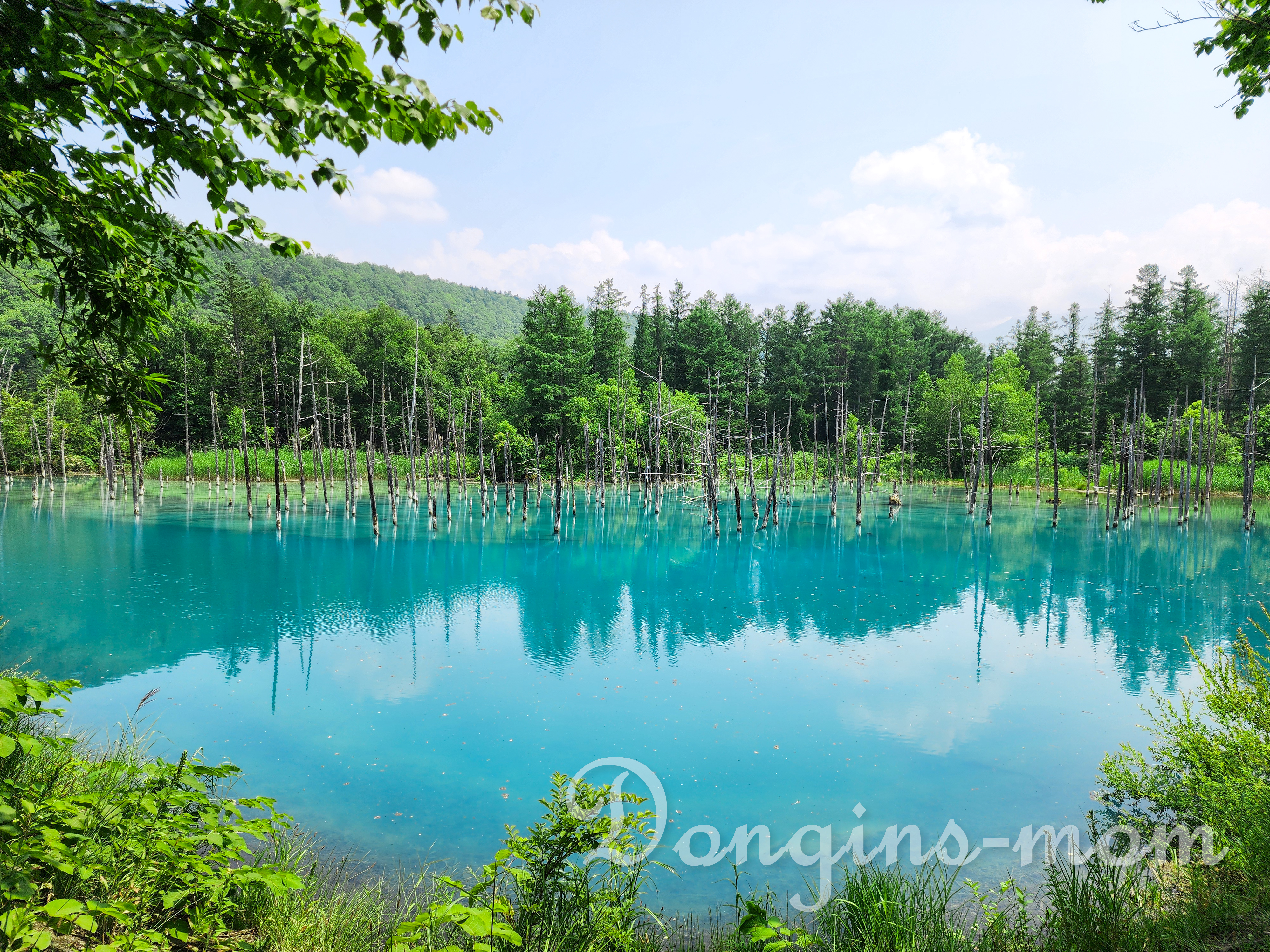 시로가네 온천의 흰 수염 폭포에서 알루미늄을 포함한 물이 흘러들기 때문에 푸른빛 호수가 형성되어 있습니다.