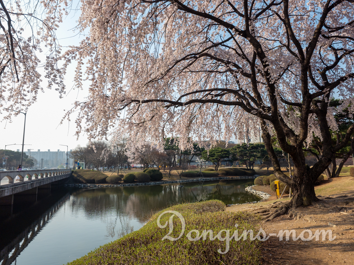 특히 오리 연못에 있는 수양벚꽃나무는 인기가 좋습니다.